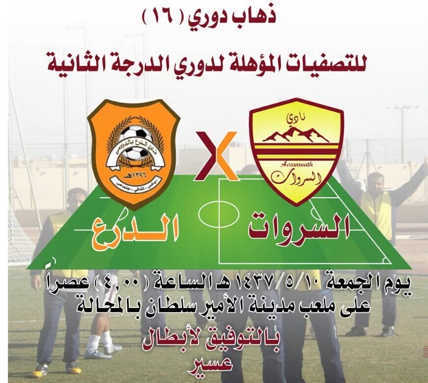 نادي السروات ، ونادي الدرع ![]() دعواتنا لنادي السروات بالتوفيق وأن يؤدي مباراة ، تليق برجالة المخلصين وأن يقدم المستوى المأمول منهم ، والظفار بالثلاث نقاط ![]()