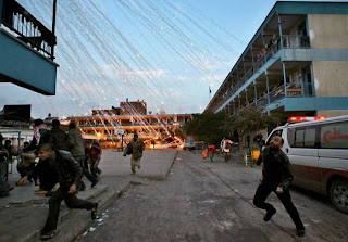 هذه الصورة حازت على جائزة التصوير الصحفي ولو بعد عدة سنوات على التقاطها، وهي تظهر لحظة سقوط قذيفة فسفورية فوق احد احياء مدينة غزة اطلقتها الطائرات الاسرائيلية ابان الحرب على قطاع غزة.(انقر على الصورة لتكبيرها) ![]()