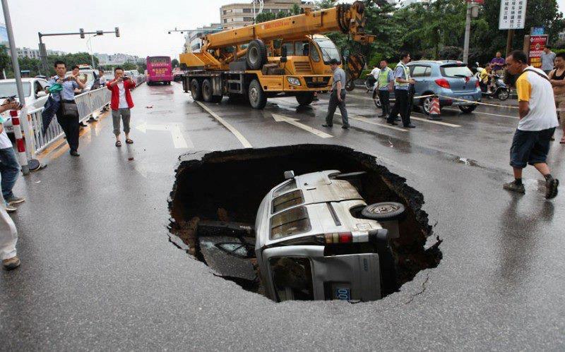 في تايلاند يلاحظ المواطنون حالة غريبة جدا في احدى مدن جنوب البلاد إذ وقعت عدة حوادث غريبة جدا وهي عبارة عن سقوط السيارات في حفر واسعة وسط الطريق المعبد، والحفرة تتشكل فجأة فتسقط الى داخلها السيارة المارة في تلك اللحظة. وتكون هذه الحفرة العميقة بقطر يزيد عن اربعة الى خمسة امتار. ويقول الخبراء ان هذا يعود الى سيول المياه تحت الشوارع التي تجرف الاتربة وتبقي طبقة رقيقة من الاسفلت تسقط تحت ثقل السيارة. ![]() ![]() |