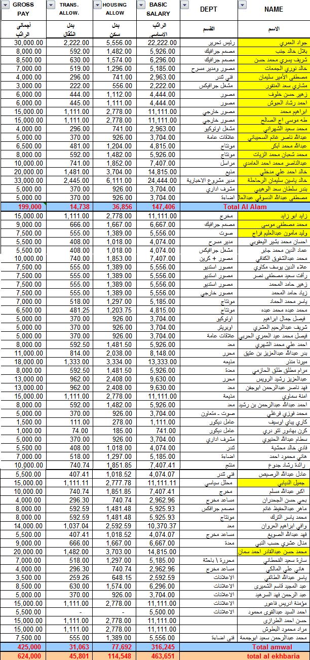 ![]() هذا مسير رواتب الشركة المنتجه لبرنامج صباح السعودية السعوديين رواتبهم بين 3 الالف الى 10 الالف وبعض الاجانب رواتبهم تصل لـ 60 الف ريال ![]() = = = = هذا مسير رواتب العاملين بقناة الاخبارية جواد العُمري اردني الجنسية على سبيل المثال يستلم ثلاثين الف ريال والرحاحلة اردني الجنسية يستلم 33 الف ريال .. بينما اغلب السعوديين بين الخمسة والعشره الاف ريال لاحظوا جميل الذيابي له راتب مع انه لا يعمل بالقناة = = = = = هذا مسير رواتب قناة اجيال طبعا السعوديين 3 الالف الى خمسة ومن زاد راتبة عن ذلك فهم اجانب ما عدا بنات طارق ريري مدير قناة الاقتصادية .. لاتعليق ![]() ![]() لا تــأسفن على غــــــــــدر الزمـان لطالما رقصت على جثث الأســــــــود كــــــلابُ لا تحسبنّها برقصها تعلو علـــــــى أسيادها تبقى الأســـود أســــودُ والكــلاب كــــلابُ |