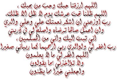 - اللّهُـمَّ إِنِّـي أسْـأَلُـكَ العَـفْوَ وَالعـافِـيةَ في الدُّنْـيا وَالآخِـرَة ، اللّهُـمَّ إِنِّـي أسْـأَلُـكَ العَـفْوَ وَالعـافِـيةَ في ديني وَدُنْـيايَ وَأهْـلي وَمالـي ، اللّهُـمَّ اسْتُـرْ عـوْراتي وَآمِـنْ رَوْعاتـي ، اللّهُـمَّ احْفَظْـني مِن بَـينِ يَدَيَّ وَمِن خَلْفـي وَعَن يَمـيني وَعَن شِمـالي ، وَمِن فَوْقـي ، وَأَعـوذُ بِعَظَمَـتِكَ أَن أُغْـتالَ مِن تَحْتـي . |
