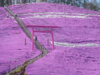 من أزهار الفلوكس، المعروفة بإسم "shibazakura".المسارات المتعرجة توصل الزوار من قاعدة التلال إلى قمتها