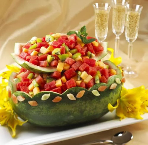 بالصور: مجموعة سلال فواكه مدهشة من البطيخ بعض سلال الفاكهة المعروضة هنا سهلة التحضير نسبيا ويمكن لأي شخص تقريبا أن يعملها. ولكن بعضها البعض الآخر معقد ويحتاج إلى الكثير من الموهبة والوقت. ويمكن عمل التصاميم بحيث تتناسب مع الحدث، سواءً أكان حفلة لرجال الأعمال حفلة اجتماعية للكبار أو للصغار ، أو مناسبة خاصة مثل مولود جديد أو عيد ميلاد أو تخرج أو عودة من إجازة، الخ.